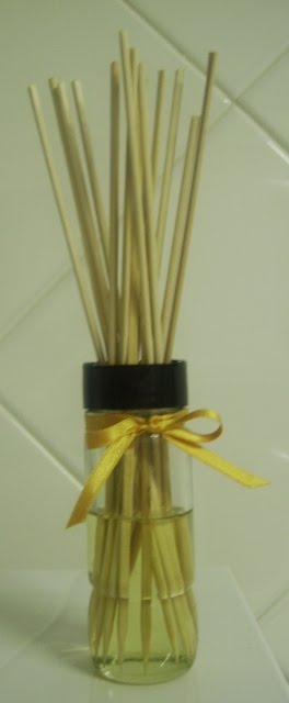 Então lembrei-me daqueles ambientadores feitos com óleos essenciais com pauzinhos de madeira metidos num frasquinho de vidro. Nunca comprei nenhum mas a ideia maluca foi fazer um caseiro com materiais que tinha em casa.